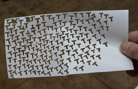 | RUG 小町をブラスト後、ふたたびマスキングをして(銀の部分)から。 | Tの文様のマスキングをします。 |