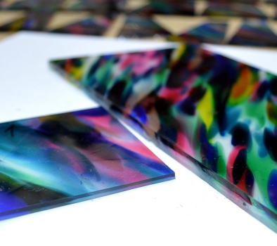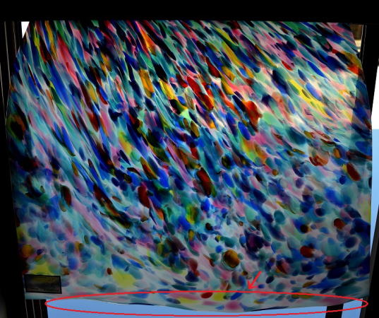| 手吹きガラスの厄介な点、ガラスの厚みが均等ではないのです、1mmの所もあれば6mmの 部分まあります、厚すぎると鉛の桟に入りません。極端に薄いと使えないのです。高価なのに! |
