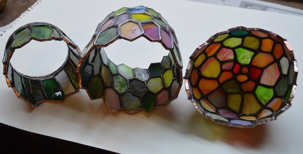 ガラスが単色でなく見る位置で 色の変化を持たせるのであれば ガラスをカットした時点で配置を 全て決めてしまいます。頭がこんが らかってパニックにならない為にも モデルを使って確認しながらの 作業になります。 |