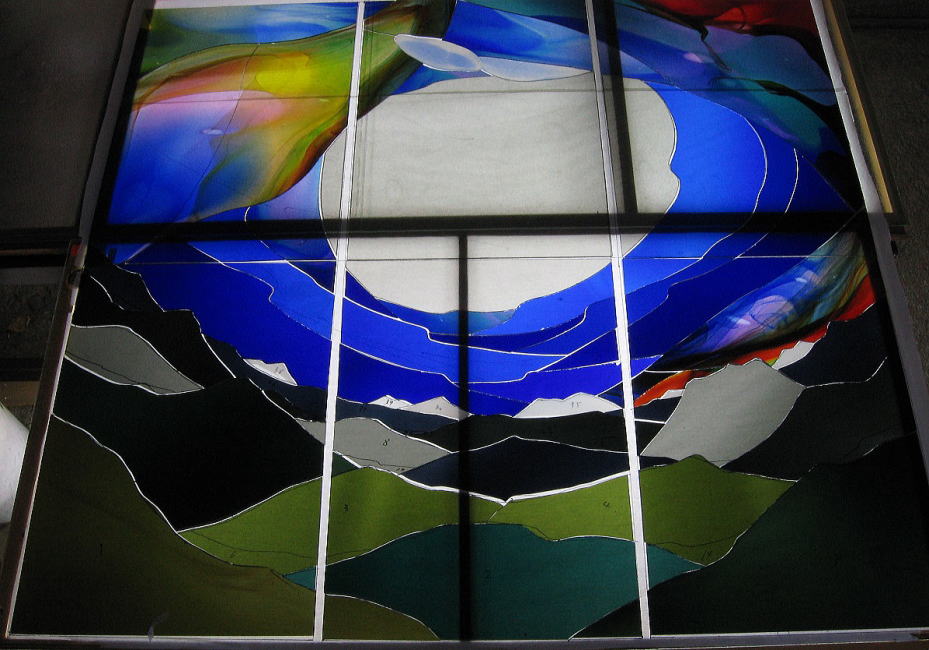 「山なみと空」のステンドグラスパネルの 完成です、空の真ん中の透明なアンティーク グラスには、遠望する常念岳が映し出され、 アンティークガラスを透した光が室内の白い壁に 映し出される計算で、取り付けが楽しみです。 |
