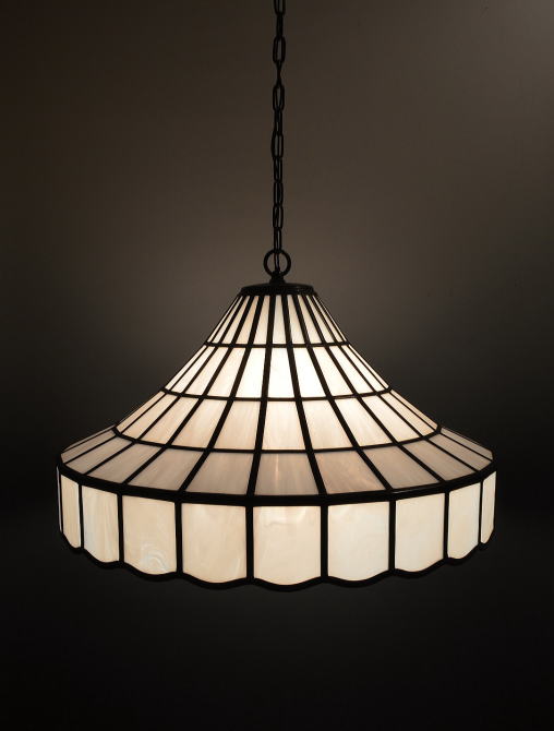 ランプシェードに人気の落ち着いた色合いの、 米国ココモ社のオパールセントグラス、1枚の 元板から切り分けた252枚のガラスを、ヨーロッパ 伝統のステンドグラス鉛線技法で組みました。 |