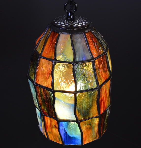 赤やブルー他様々な色の混じったガラス を切り分け配置しています。この面は鮮やかな 赤、ブルー、黄色など派手で賑やかです。 形が歪んで見えますが…、歪んでいますね。 |