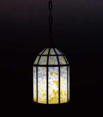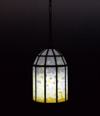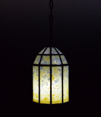 露草色のランプシェード アメリカのブルズアイ社で造られたガラス 30枚を鉛桟で組み上げました。 120cmのクサリと天井取り付け金具が 付属します。クサリを含む重量は約 1.6kg お取り付けは専門業者にご依頼下さい。 ![]() |