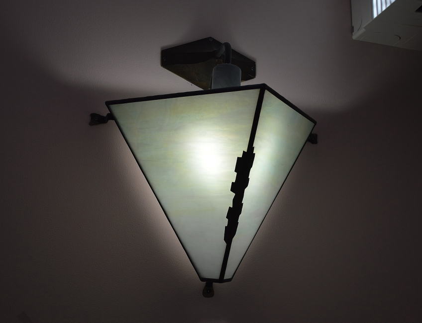 | 壁に取り付けるタイプの照明器具、3枚のガラスを組み金具で固定してあります。 |