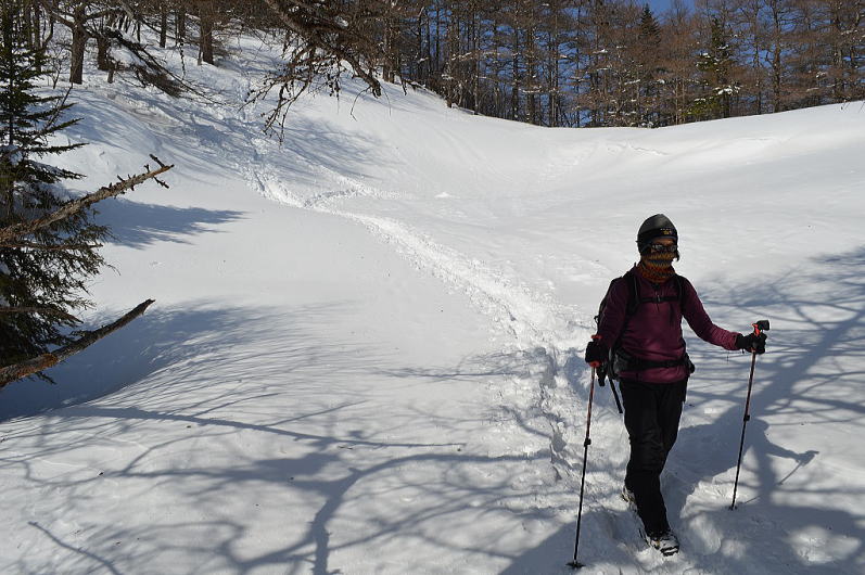 | トーミの頭から中コース分岐への降り、通過には要注意。 | 下山は中コースにしました、谷なので雪の状態によっては苦労しそうです。 |