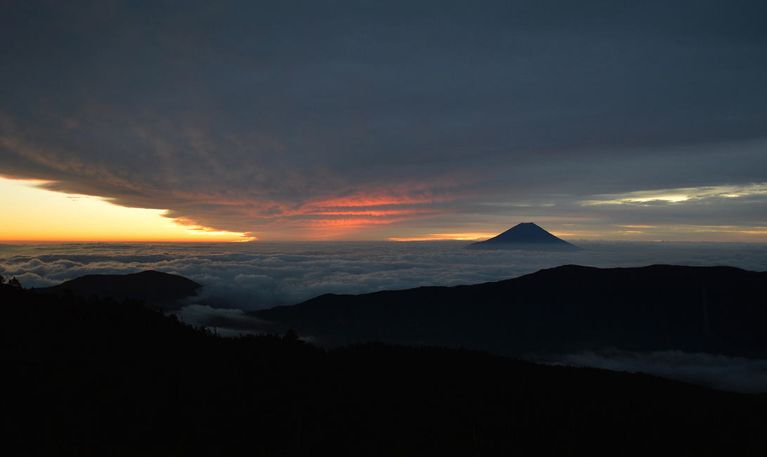 | 9月19日朝、 あいにく日の出の位置に雲がかかり残念でしたが雲海と赤く焼けた雲の美しさは山ならではの景色でしょう。 |