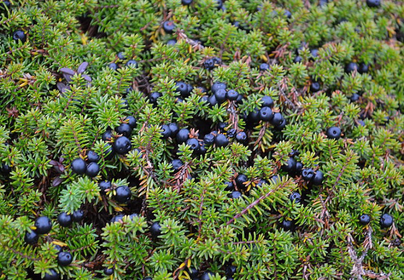 めずらしくたわわに実ったガンコウランの実。 独特な風味と微かな甘味があり、大粒の実は 美味しいです。赤く紅葉したウラシマツツジも 黒く熟した実をつけていましたがこちらは 不味く食べられません。 |