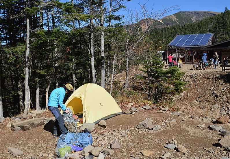 10月11日〜12日秋の連休です。 四国からのお客様を赤岳に案内しました。 北沢コースを登り行者小屋に着いた時には テン場も埋まり大勢の登山客で賑わっていました。 |