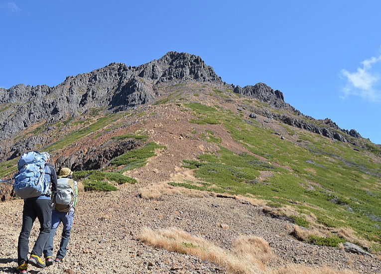 中岳のコル。 日頃のガイド中は危急時対応の救急セット ロープなどそれだけでも結構な重量になりますが 今日の荷物の軽いこと、好天の稜線歩きは快適 です。 |