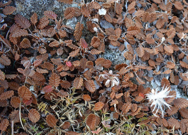 枯れてもすぐそれとわかるチョウノスケソウの 特徴あるはっきりした葉脈の葉と綿毛。 |