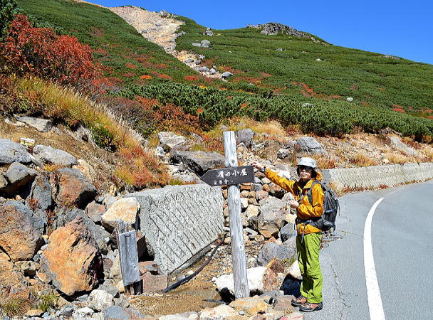 先の乗鞍岳ガイドでは予想外の紅葉の 美しさに惹かれプライベートで訪れました。 残念ながらこの所の冷え込みもあり紅葉は 過ぎていて思ったほどではありませんでした。 紅葉の撮影はあきらめて大雪渓下から剣ヶ峰 まで登ることにしました。 |
