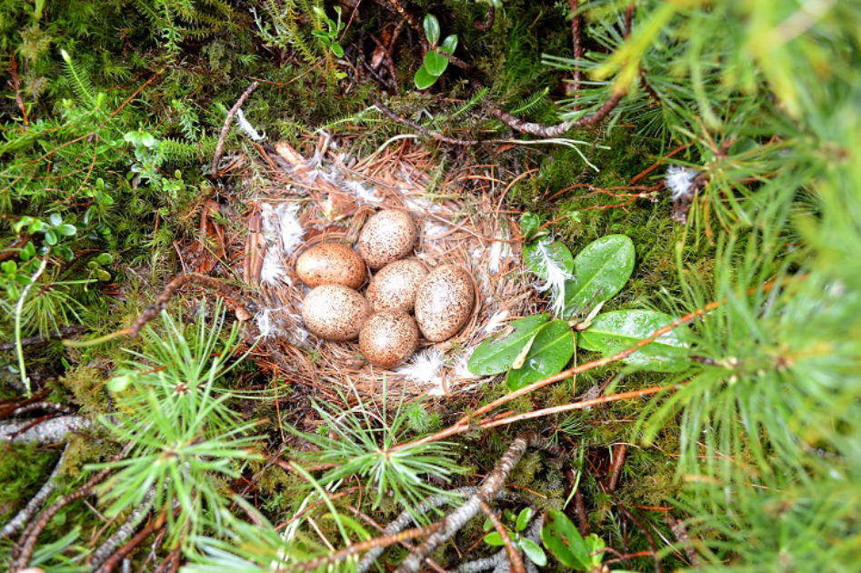 | 6個の卵を抱いていました。ライチョウは2日に1個、10日から2週間かけて卵を生み苔などげ覆い隠して置きます、 全部生み終わってから抱き始めるのだそうです、なるほど!いっせいに孵化して同じサイズで育てる…。 |