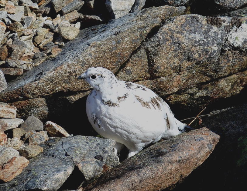 | ライチョウ調査はお天気次第、ドピーカンの登山日和など絶望的です。 例外的にどう見ても日向ぼっこをしていた今年生まれた雌が暖かそうな 岩陰にチョコンと座っていました。 |
