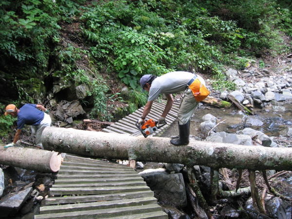 整備された橋、岩魚留小屋から上流は 自然木を利用したものが多く見受けられ ます。 次の写真は、2007年岩魚留小屋〜徳本峠 間の登山道整備に参加、この場所に架けた 時のものです。 |
