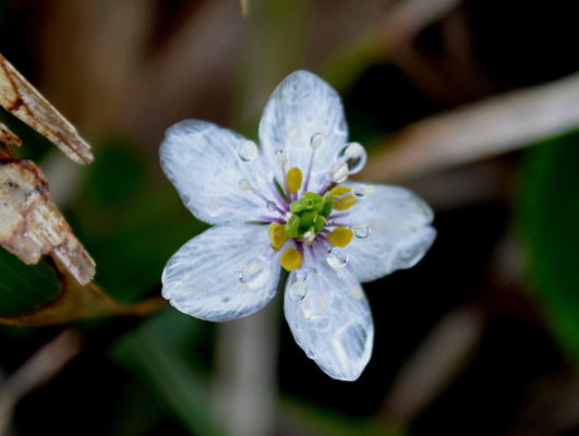 | 露に濡れて半透明になった花びらの模様に思わず見入ってしまいます。 |