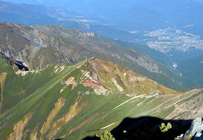 五竜岳山頂から見下ろす山荘 山頂で気分的には終了しているので テン場までの40分は長く感じるのでした。 |