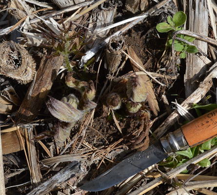 ウドを収穫した後は、囲いともみ殻を 取り除き、いくつかの芽を残してたっぷり 光合成させて来年のために根を育てます。 |