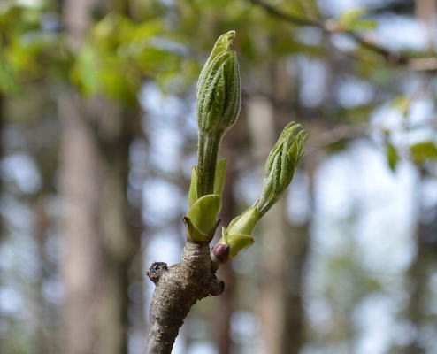 | ハリギリ、飛び出たような太くて鋭いとげが特徴、こんもり太めの新芽はいかにも 美味そうですが、ウコギ科の中では一番アクが強いのでアクを抜いて利用します。 |