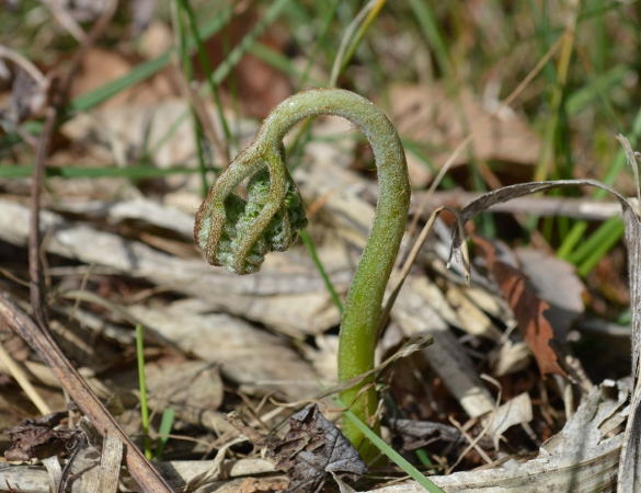 ようやく頭をもたげたワラビ、この位の ものは目が慣れないとほとんど見えません、 まるで忍者のよう、顔を下げて真横から 見ると良く見つけられます。 |